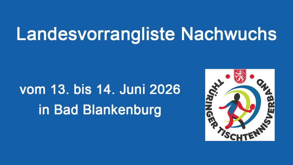 Die Landesvorrangliste (LVRL) Nachwuchs 2026/27 wirft ihre Schatten voraus. Die besten Nachwuchstalente bereiten sich auf spannende Wettkämpfe vor. In den verschiedenen Altersklassen wurden bereits einige Spielerinnen und Spieler aufgrund ihrer Teilnahme an den TT-Finals durch den Jugendausschuss von der Landesvorrangliste freigestellt. In jeder Konkurrenz sind drei Spieler/-innen aufgrund ihrer QTTR-Werte vom 11. Februar 2026 vorqualifiziert. Alle anderen Spieler/-innen haben die Chance, sich über die Kreis- und Bezirksranglisten einen der begehrten Startplätze für das am 13./14. Juni 2026 in Bad Blankenburg stattfindende Turnier zu sichern. Liste der Freistellungen und Vorqualifizierten für die LVRL Nachwuchs als PDF-Datei gez. Sören Korn, Vizepräsident Jugend