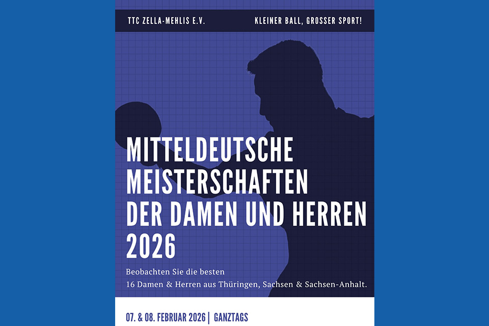 Zella-Mehlis/Erfurt. Am Samstag, 7. Februar, und Sonntag, 8. Februar 2026, ist Zella-Mehlis Gastgeber eines hochklassigen Tischtennis-Events: In der Dreifeldersporthalle an der Schillerschule finden die Mitteldeutschen Meisterschaften der Damen und Erwachsenen statt. Die besten Spielerinnen und Spieler aus Thüringen, Sachsen und Sachsen-Anhalt kämpfen dabei nicht nur um die Titel, sondern auch um die Qualifikation für die […]